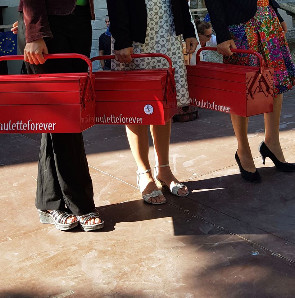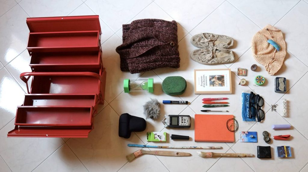 3 artistes en résidence autour d’une caisse à outils contenant un enregistreur audio, un costume de théâtre, un cahier et un stylo, une boite de craie, un appareil photo, un nécessaire à couture …